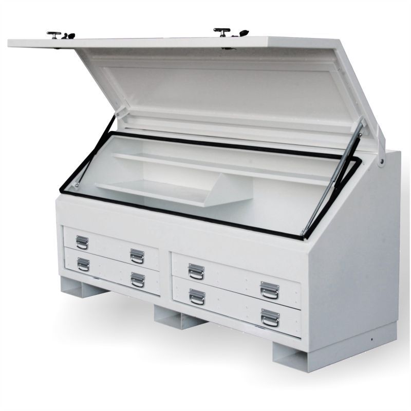 CONTRACTORONE - "The original one & only BKAT truck boxes". These truck / ute boxes are designed and manufactured TOUGH. The perfect heavy duty work box to suit your vehicle and application. A “Premium Quality Truck Box”, and when you choose a ContractorOne BKAT box you know are getting a great product every time. Designed to suits all types of trades people and the back of work vehicles. Steel powder coated ripple white and UV stable the boxes are ideal for trades people, builders, carpenters, plumbers, electricians, farming, forestry, mining, construction, local government and much more. The full door covers the drawers for even more protection against harsh conditions. A serious large truck toolbox.