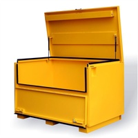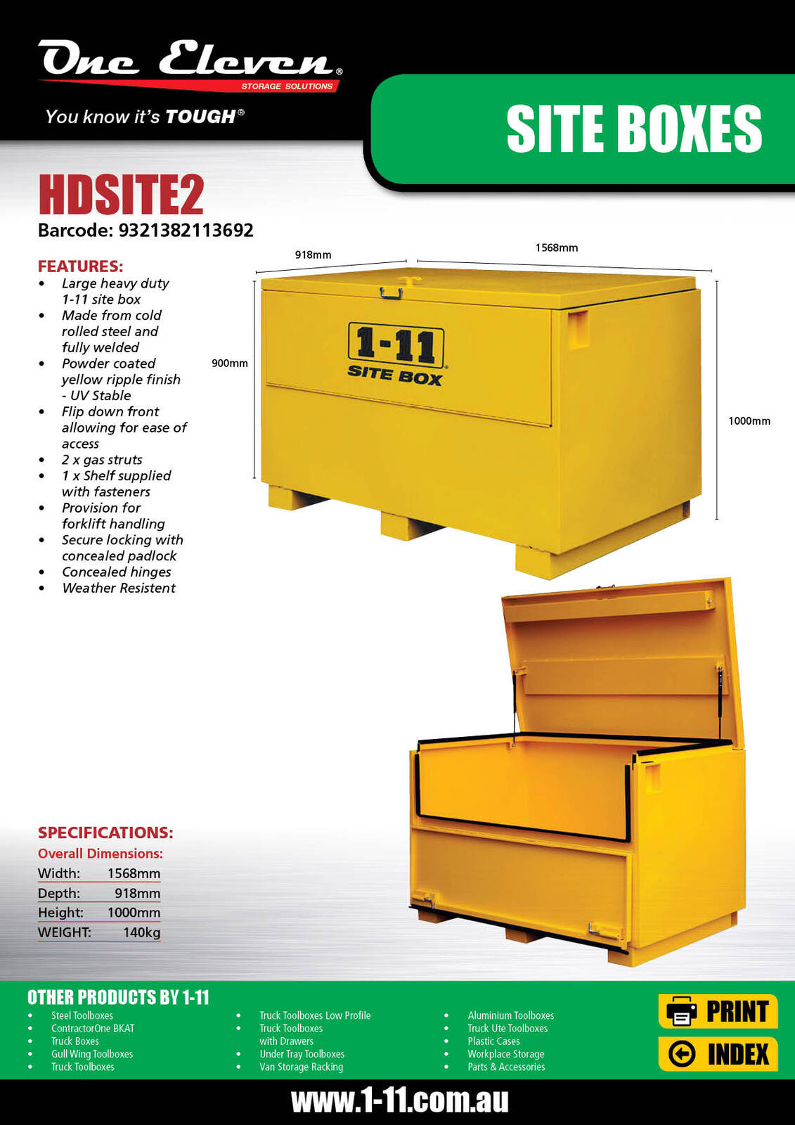 1-11 site boxes are built TOUGH for Australian conditions. Packed with features this extra wide large site box comes with gas struts, is fully welded for maximum strength and includes a bright yellow UV stable powder coating for better visibility onsite. The flip down front provides better access to the inside and the rubber seal helps keep dust and water out. We call this 'the big daddy' of steel site boxes and it's popular due to the overall size with trades people needing a large amount of storage space. Ideal for builders, carpenters, plumbers, electricians, farming, forestry, mining, construction, local government and much more.